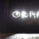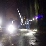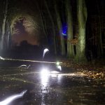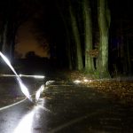 Setting war diesmal eine Baumreihe in einem Wald an einer Asphaltstraße. Kamera auf Stativ, Belichtungszeit bis zu dreissig Sekunden, und dann schauen wir doch mal was diese Lampen für Spuren zeichnen wenn sie fröhlich über den Asphalt scheppern. Und aufprallen. Und hochgeworfen werden. Und wieder aufprallen und weiterrutschen.